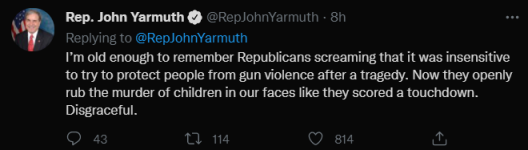 马西此举引发同僚愤怒。路透社称,美国众议院预算委员会主席、民主党人约翰·亚尔穆斯对这位肯塔基州议员予以强烈谴责。他发推称:“我保证不是每个肯塔基州的人都是麻木不仁的混蛋。”“我年纪足够大了,可以记得共和党人曾在(枪击事件)悲剧后大喊大叫称(有人)是麻木不仁的,试图保护人们免受枪支暴力。现在他们(却)公然当着我们的面说谋杀儿童的事,就像他们触地得分一样。真可耻。”↓