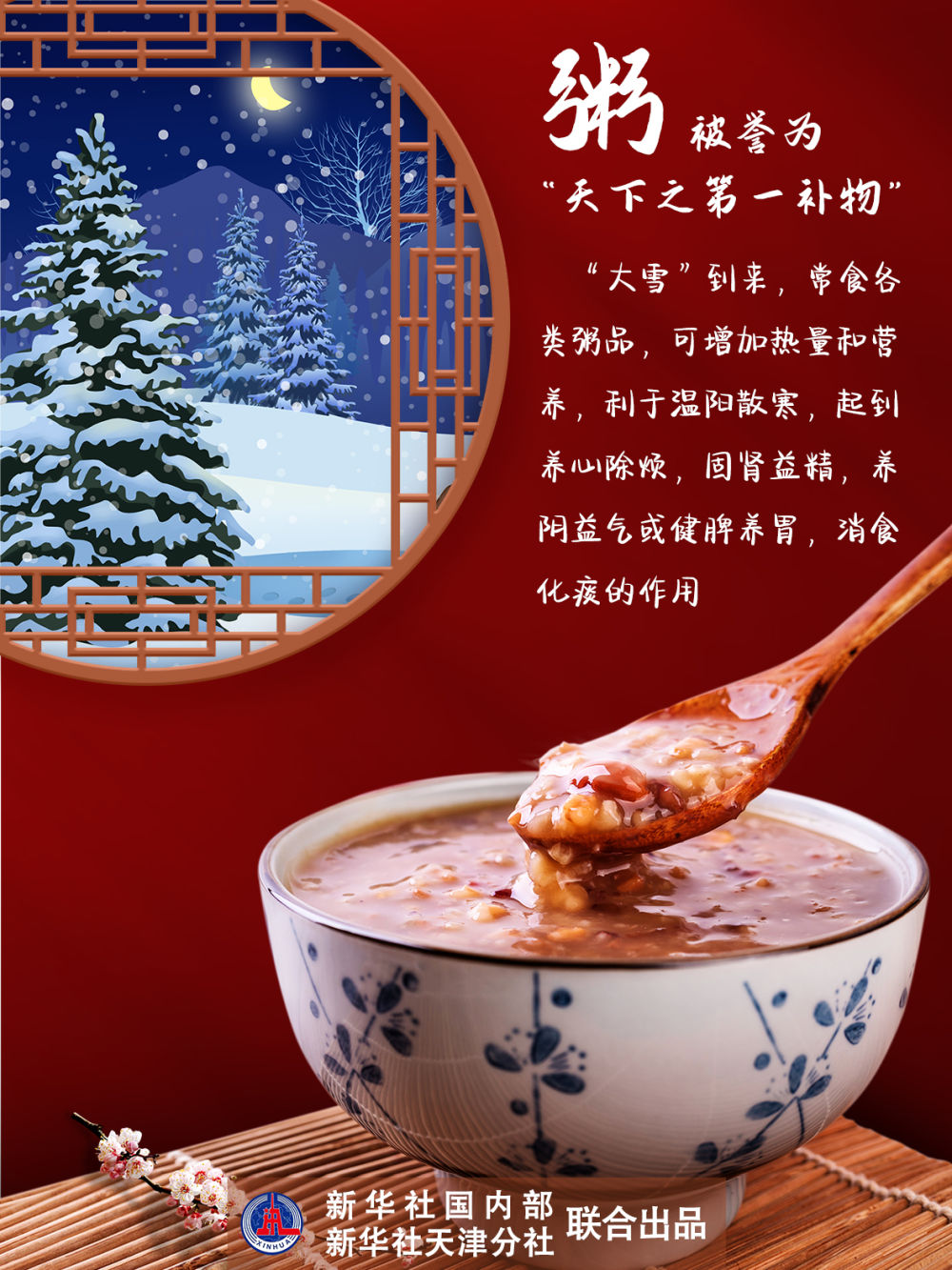 粥,被誉为“天下之第一补物”。“大雪”到来,常食各类粥品,可增加热量和营养,利于温阳散寒,起到养心除烦、固肾益精、养阴益气或健脾养胃、消食化痰的作用。但粥在食用后容易使血糖快速提升,糖尿病患者需控制食量。