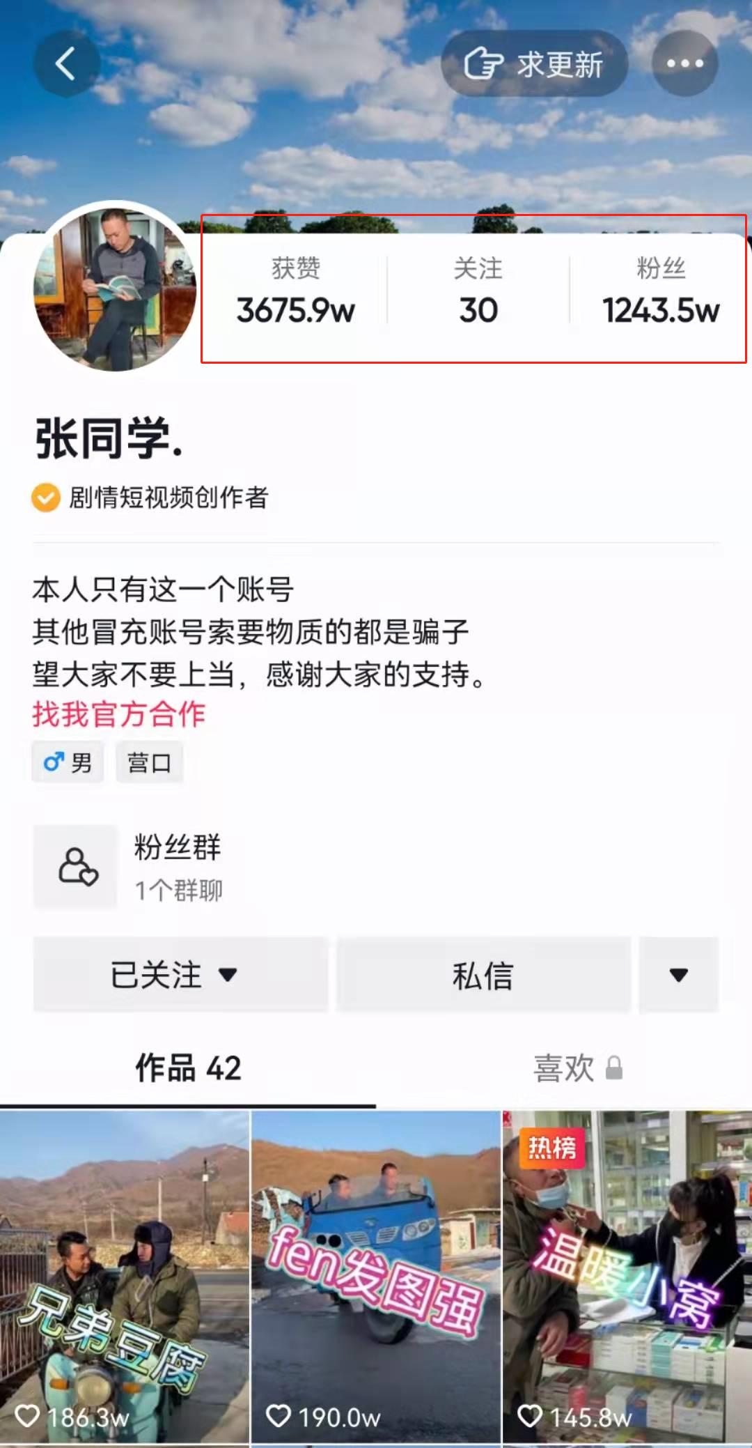 红星资本局注意到,目前张同学在抖音的认证为“剧情短视频创作者”。