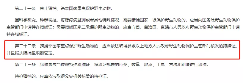 但野猪属于“非重点保护的国家野生动物”,按照《中华人民共和国野生动物保护法》(以下简称《野生动物保护法》)相关规定,猎捕非国家重点保护野生动物的,必须取得狩猎证,并且服从猎捕量限额管理。