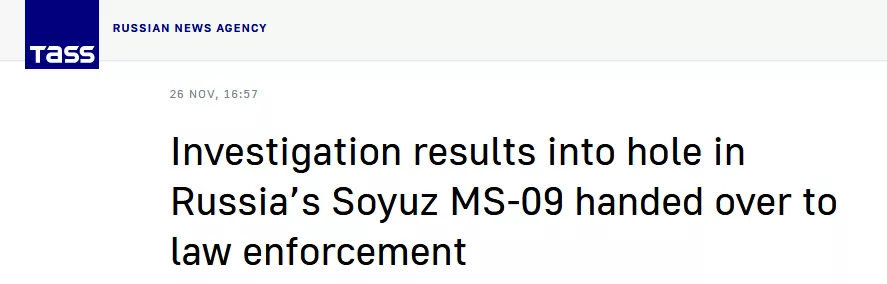 2018年8月,负责运送宇航员和物资的俄罗斯联盟号飞船Soyuz MS-09被监测到“漏气”,宇航员在舱壁上竟发现了一个贯穿的小洞。