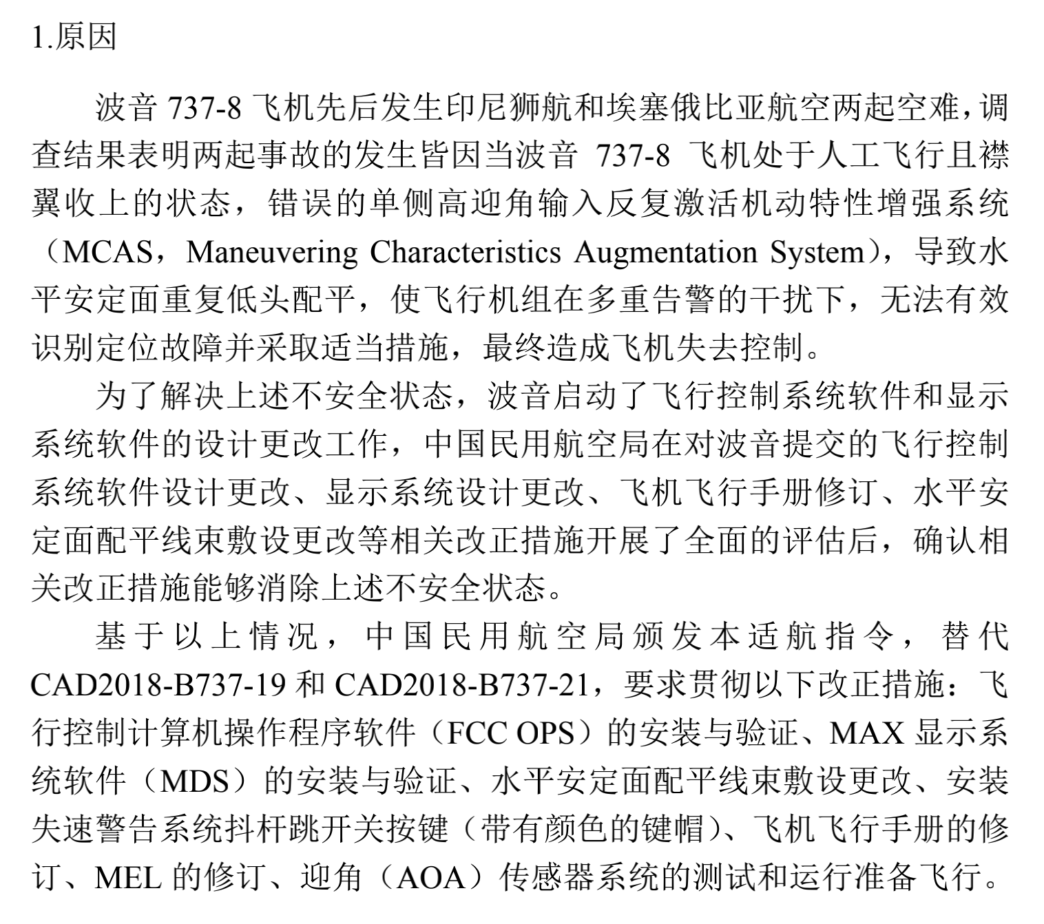 基于以上情况,中国民用航空局颁发本适航指令,替代CAD2018-B737-19和CAD2018-B737-21,要求贯彻以下改正措施:飞行控制计算机操作程序软件(FCC OPS)的安装与验证、MAX 显示系统软件(MDS)的安装与验证、水平安定面配平线束敷设更改、安装失速警告系统抖杆跳开关按键(带有颜色的键帽)、飞机飞行手册的修订、MEL 的修订、迎角(AOA)传感器系统的测试和运行准备飞行。