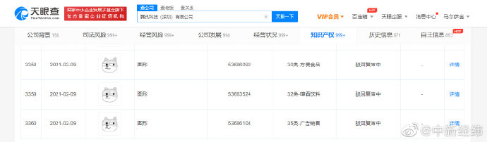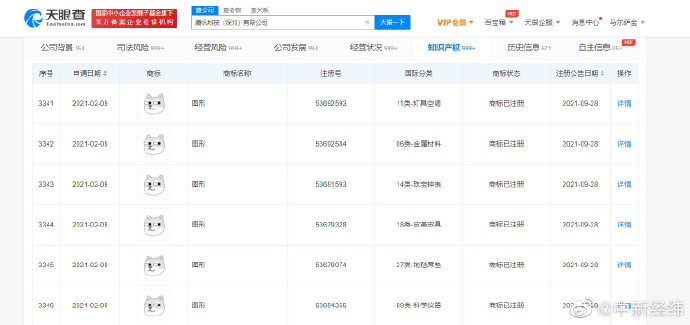 天眼查App显示,近期,腾讯科技(深圳)有限公司申请注册的部分“狗头”商标注册成功,国际分类涉及科学仪器、金属材料、健身器材等。
