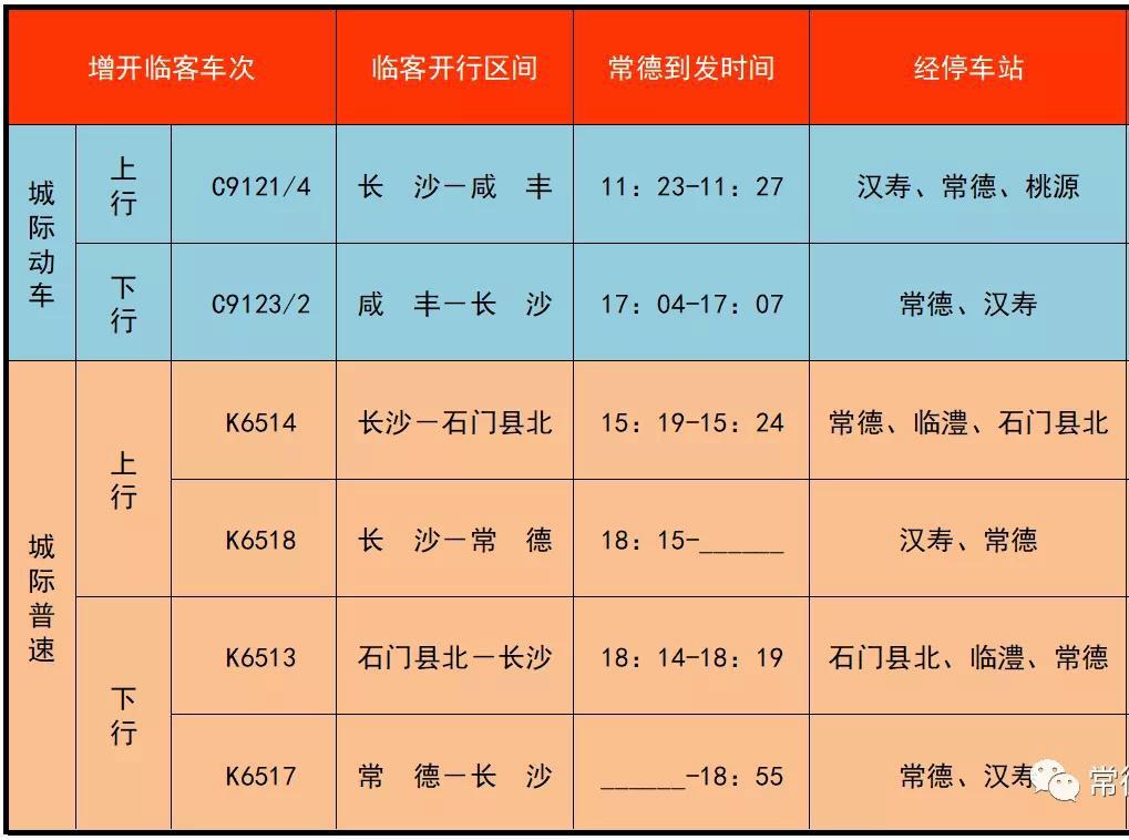 2022 年 1 月 1 日至 3 日将迎来为期 3 天的元旦节小长假。石长铁路常德市内汉寿、常德、临澧、石门县北,黔张常铁路常德市境内桃源、常德(与石长铁路共站)5 座客运火车站增开 3 对临客城际列车。按照发车时间先后顺序依次如图。