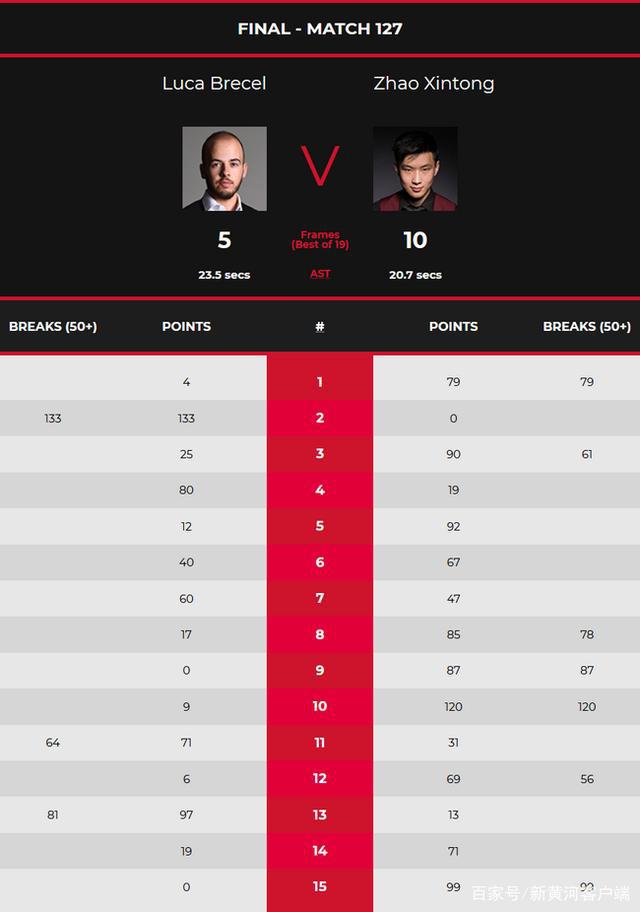决赛第一局,赵心童单杆 79 分制胜,79-4 赢下,1-0 强势开局。第二局,布雷切尔回敬轰出单杆 133 分,133-0 零封赵心童,1-1 扳平比分。第三局,赵心童打出单杆 61 分,90-25 胜出,2-1 领先。第四局,切尔 80-19 胜出,比分变成 2-2。