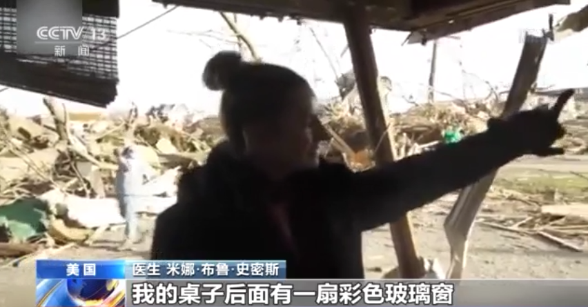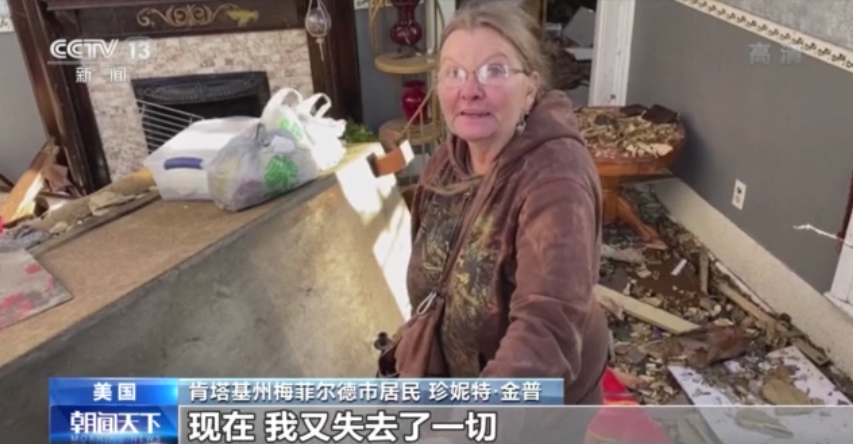 肯塔基州梅菲尔德市居民 珍妮特·金普:(龙卷风袭来时)家里后门直接拍到了我的脸上,我吓得赶紧逃到另一边,我的儿子当时也在走廊里呼喊我。当时风太大了,我差点跌倒。这次灾害让我失去了一切,此前,我的房子由于着火被毁,我们后来不得不重建。之后,我的丈夫去世了,我不得已申请了破产。现在,我又失去了一切,我再次失去了所有。