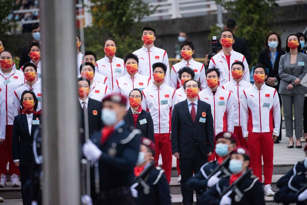↑12月20日,内地奥运健儿代表团在升旗仪式上。新华社记者贾浩成摄