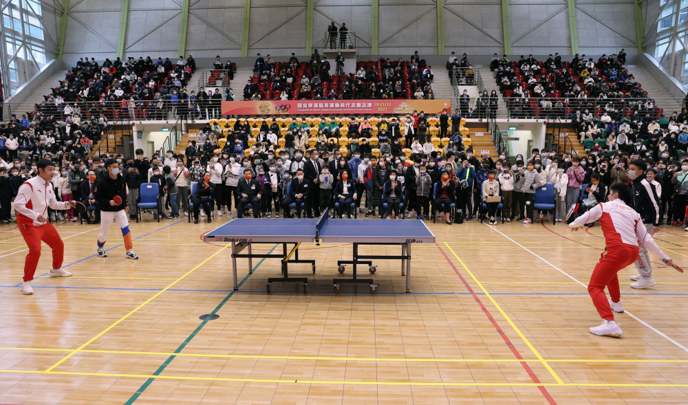 ↑12月20日,内地奥运健儿代表团成员许昕(前左一)、马龙(前右二)与澳门青少年运动员在交流活动中切磋球技。新华社记者贾浩成摄