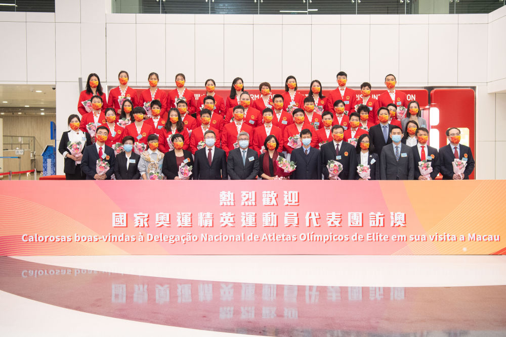 ↑12月19日,内地奥运健儿代表团成员与澳门特区代表合影。新华社记者张金加摄