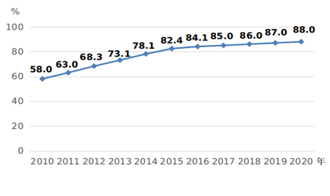3.农村人居环境持续改善。2018年,中央农办等18个部门联合印发《农村人居环境整治村庄清洁行动方案》,启动并实施村庄清洁行动,目前农村人居环境整治三年行动方案目标任务全面完成。全国95%以上的村庄开展了清洁行动,村民的环境与健康意识进一步增强,村庄环境趋于干净整洁。2020年,农村集中式供水受益人口比重达到88.0%,比2010年提高30个百分点,实现《纲要》“达到85%左右”的目标(见图8)。