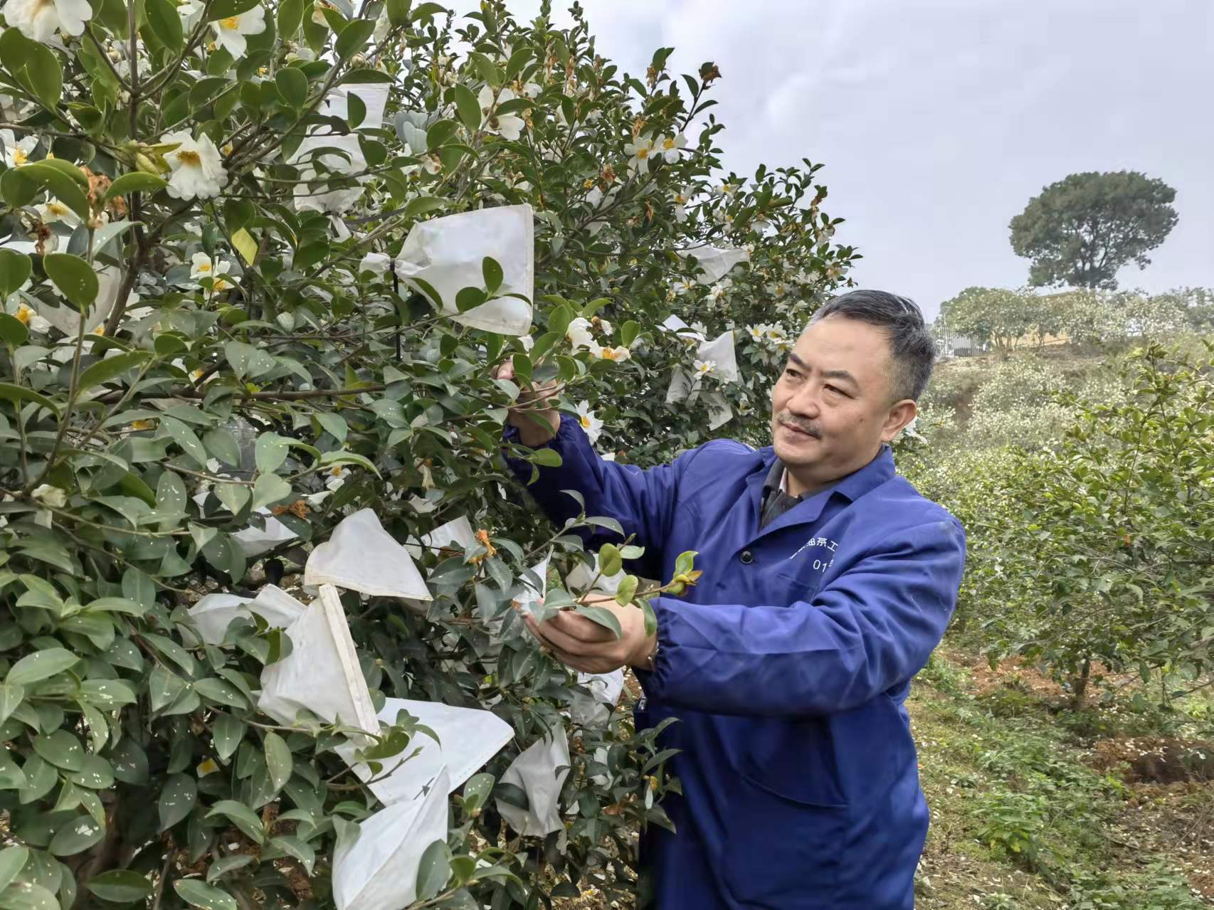 抱着这样的希望和憧憬,陈永忠奔走在14个省的油茶产区,跋山涉水,风餐露宿,收集各种种质资源。开展杂交育种时,连续几个星期在油茶林中穿行,找花蕾,配花粉,期望得到理想的种子。一天下来,陈永忠身上黄一块白一块,满是黏糊糊的花蜜和花瓣,脖子和举了一天的手臂都酸痛难忍,晚上还要与蚊虫相伴,整理材料和数据。