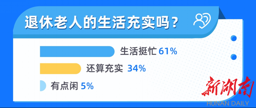 大众卫生报•新湖南客户端12月25日讯(通讯员 鮑杰)天天喊着早日退休,但退休生活真的很轻松吗?12月23日,一份针对5000名年龄在55-70岁的老年人调研后撰写的《2021年老年人退休生活趋势报告》发布,报告显示,越来越多的老年人退休生活变得忙碌和充实,这与他们尝试年轻人生活方式、积极适应数字化时代有着密切关联。