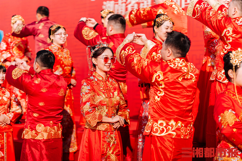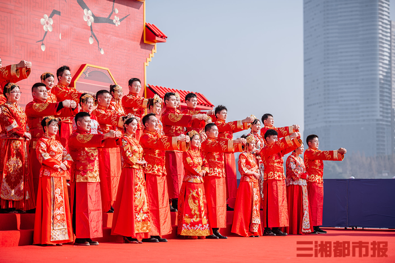今日,“有国才有家——湖南省第三届国潮集体婚礼”在长沙橘子洲头举行,100位新人共同行交拜礼、执手礼、合卺礼......许下爱国爱家、相守一生的承诺。