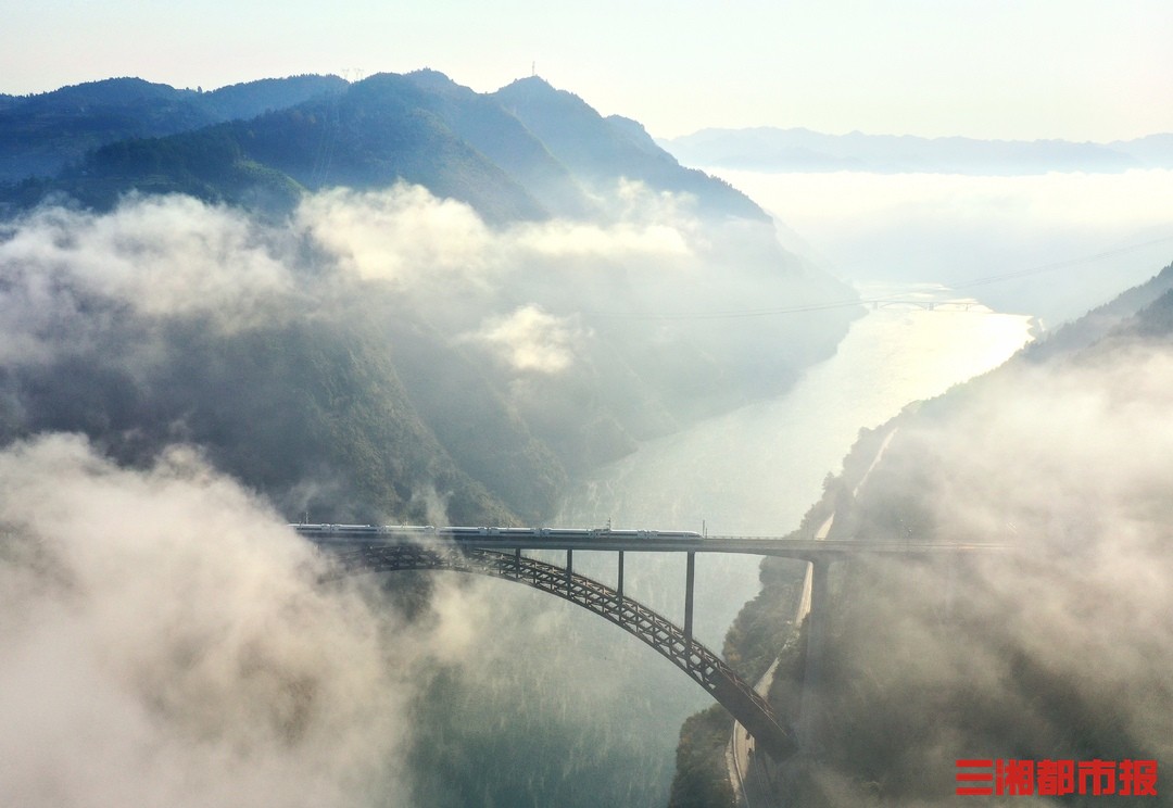 (12月6日上午,张吉怀高铁酉水大桥段,一趟高铁列车组急驰在“神秘大湘西”的美丽山水间。湖南日报全媒体记者 李健 摄)