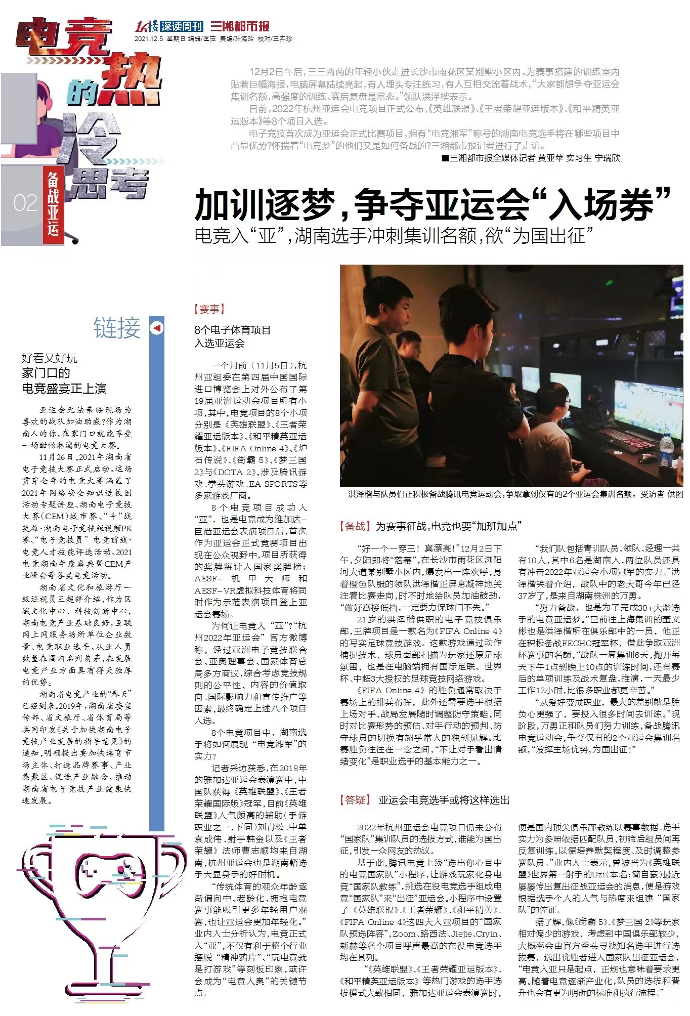 11月5日,2022年杭州亚运会电竞项目正式公布,《英雄联盟》、《王者荣耀亚运版本》、《和平精英亚运版本》等8个项目入选;2天后,中国LPL赛区战队EDG逆风翻盘,成为第三支在“S11世界赛(英雄联盟2021全球总决赛)”上夺冠的中国战队。