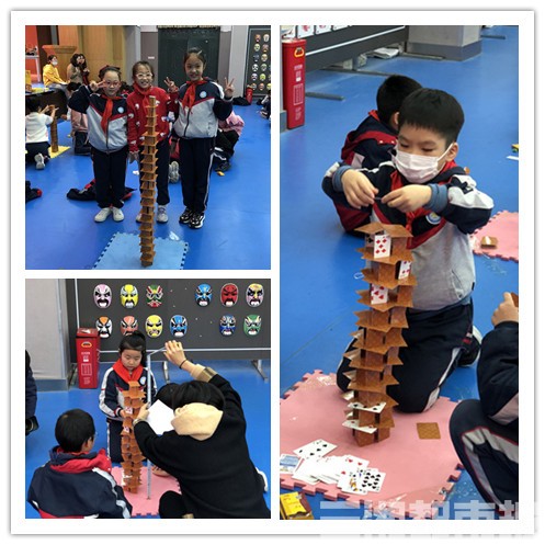 在如火如荼的纸牌搭高塔比赛现场,孩子们3人一组比拼谁的高塔高。“慢点慢点,稳住……”四(4)班的黄歆婷在伙伴们的提醒下,小心翼翼地将第108张纸牌摆到塔顶的位置,“我们成功啦!”大家欢呼起来。经过测量,她们搭出了1.15米高的20层纸牌塔。为了搭出这座高塔,黄歆婷和小伙伴们作出了各种尝试。“因为菱形比较稳固,我们在底部搭建的菱形纸牌塔座,而为了足够高,在塔尖部分又搭建了三角形纸牌,这样既能高又能稳。”