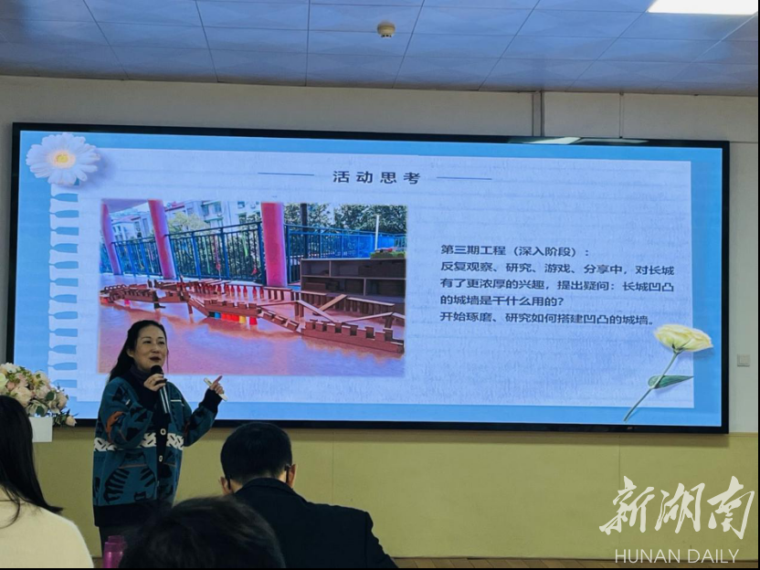 杨老师分享《区域活动自我评价的思考——以大班建构区为例》,结合大班多元整合《好大一个家》这一主题,介绍本班的区域活动的区域设置并着重对建构区《长城•天安门》这一区域游戏内容序列化的推进进行了分析与反思。