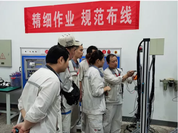 为了提高职工的精细作业和艺术化布线能力,谢光明现场给职工做示范和讲解。