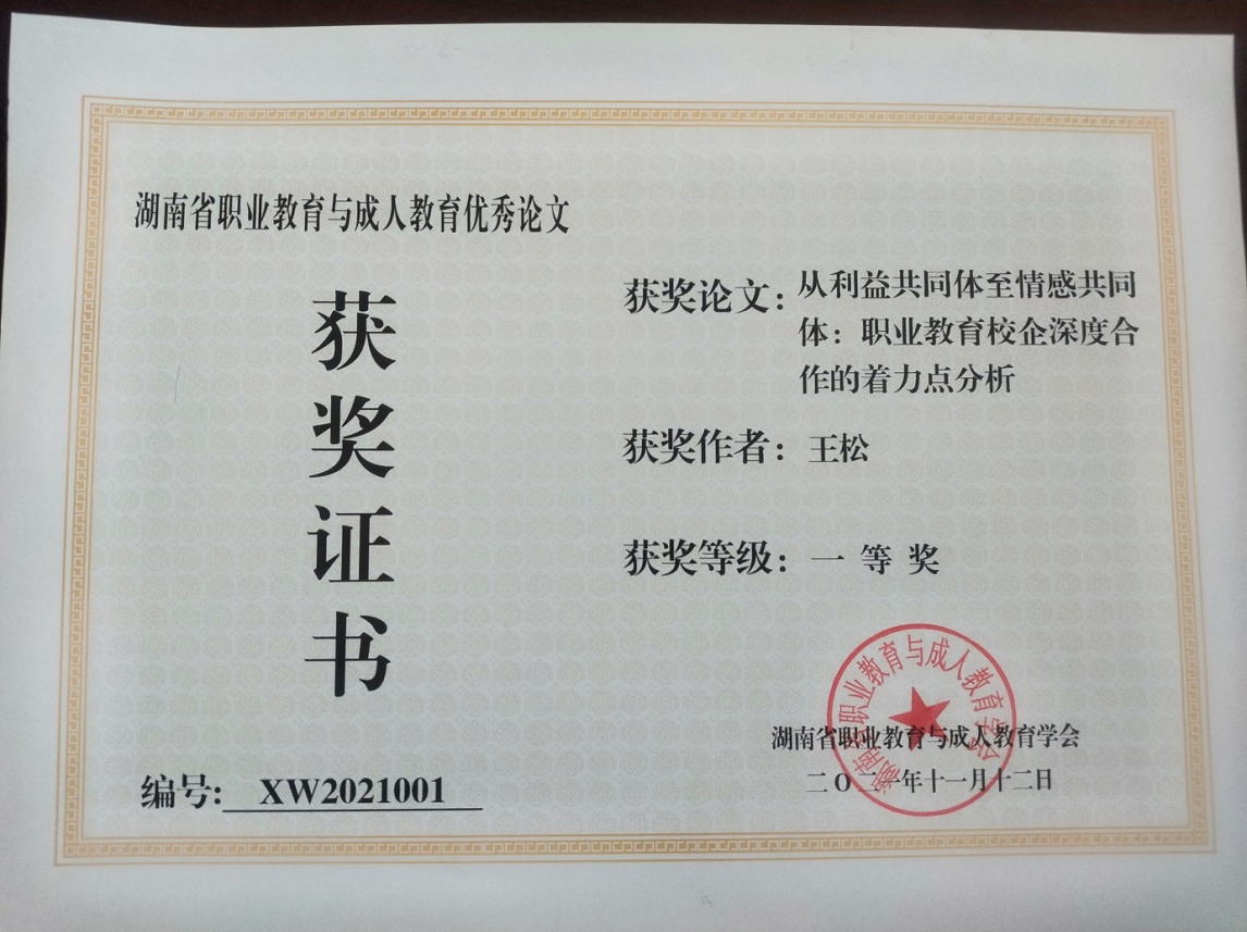 会上,湖南省职业教育与成人教学学会会长田刚还宣读了《关于表彰2021年度先进分支机构的通报》和《关于公布2021年优秀论文评审结果的通知》,学校高职公共管理与服务类专业委员会荣获先进分支机构,教务处王松老师的《从利益共同体到情感共同体:职业教育校企深度合作的着力点分析》获优秀论文一等奖,通识教育中心赵绚丽老师的《CIPP视域下高校提升创新创业教育质量研究》获三等奖。(王松)