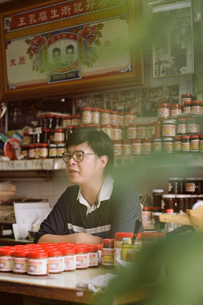 走进店内,腐乳的味道扑面而来。店铺约四十几平方米,呈狭长布局,前台货架上摆放着腐乳和其他酱料。穿过一道门,后面是制作和包装产品的作坊,廖家雇用了两位工人,负责将腐乳块和酱料装进透明玻璃罐。