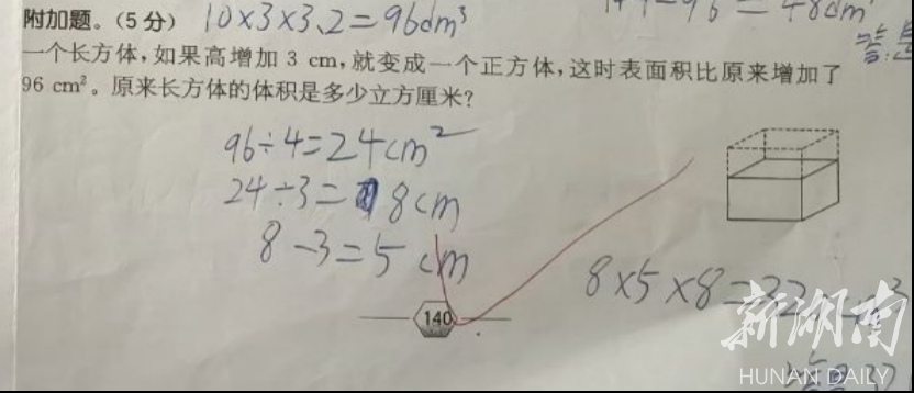 在这学期的第三单元测试中,大家都在为附加题而冥思苦想时,我有意走到她旁边,看看她的做法。发现她已写好了第一个算式“96÷4=24”,在想接下来该怎么做。于是我悄悄提醒:“24平方厘米表示什么呢?与“高增加3㎝,就变成一个正方体。这个条件有什么关系呢?”她思索片刻后,莞尔一笑,说:“谢谢老师,我知道了。”下图是她的解题过程,还真的做对了。这次考试她居然上了九十分。