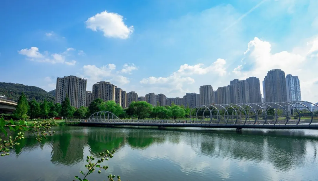 初秋阳光下,龙王港河面清风徐来,碧波粼粼,两岸绿化风光独好,人、河、山相映成趣。