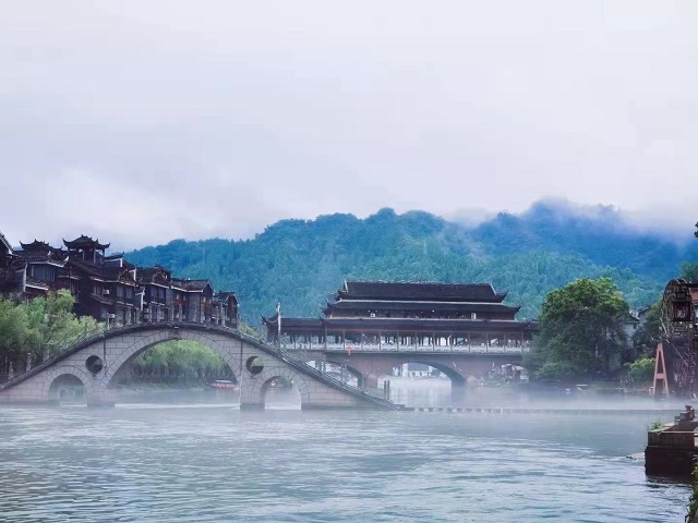 漫步在凤凰古城,名胜古迹与自然风光交相辉映,古城、吊脚楼……神秘湘西文化在这里呈现。古城石板街道纵横交错,古色古香,来来往往的行人早已将街道上的石板磨得光滑透亮,走在上面发出清脆的响声。街道两旁木楼房檐错落有致,别有一番风味。清晨,站在江边,江面上笼罩一层层薄薄地白雾,宛如仙境一般。沱江两岸飞檐翘角的吊脚楼连成一片,在清晨的雾气中若隐若现,使人不禁赞叹:“天下凤凰,江南水乡”。用“烟迷水乡景朦胧,雨霏丝丝育花红”来描绘这幅图景再适合不过了。到了晚上,凤凰古城的沱江又是另一幅美景了,城两边吊脚楼的彩灯闪耀,宛如镶上了金边,与水中的倒影交相辉映,波光粼粼,甚是好看。这时,街道两旁的商店,游人如织,店家热情地招呼着游客。“快来尝尝我们家的姜糖!”“卖湘西腊肉喽!”“试穿一下苗族传统服饰呀。”热情的吆喝声此起彼伏。整个古城空气中都弥漫着腊肉、烤串和米酒的香气,游客们欢声笑语回荡在凤凰古城上空,顿时,古城成了人们幸福的乐园。