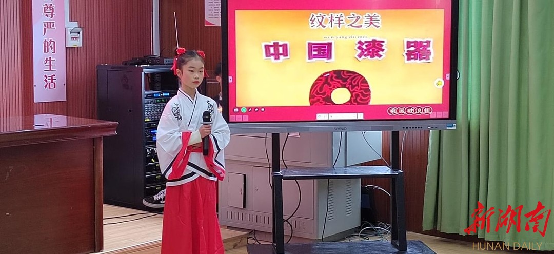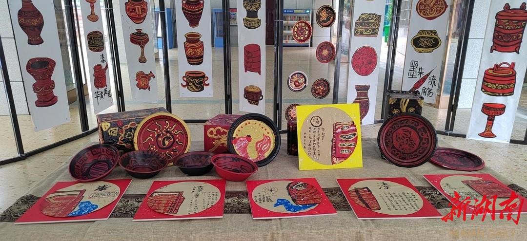 看到驻足欣赏啧啧赞叹的观众们,美术组老师们甚为欣慰,侯婷自豪地介绍道,“这是我们师生一个多月来的汗水结晶,在同学们的手中,它们不仅是一件美术作品。同学们以湖湘漆器为切入点,挖掘湖湘历史,弘扬湖湘文化。”