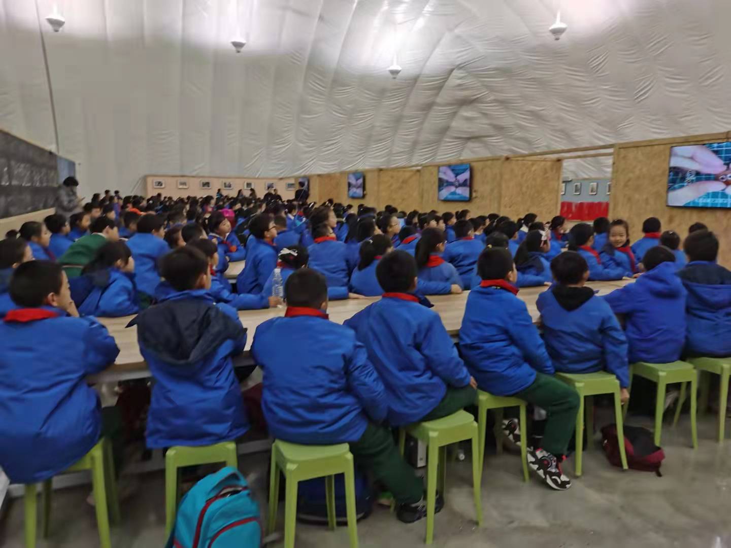 冬天的阳光透过车窗照耀在我们身上,格外地温暖。我们就像一群快乐的小鸟,在大巴车上欢声笑语还唱起了歌儿。经过一小时的车程,我们终于到达目的地——湖南日报华声研学实践劳动教育基地。一下车,我们便被眼前的场景所吸引:好多个白色的充气帐篷连在一起,宛如妈妈蒸的那又白又胖,又松又软的“大馒头”。