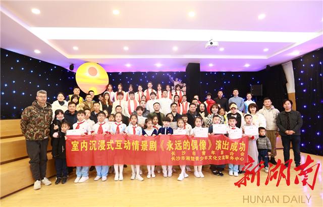 湖南日报•新湖南客户端12月25日讯(记者 王晗 通讯员 曹茜)为隆重纪念毛泽东同志诞辰128周年,《永远的偶像》室内沉浸式互动情景剧今天在长沙市新兴青年活动中心如期上演。该剧由共青团湖南省委指导,共青团长沙市委、长沙市青年联合会主办,长沙市湘楚青少年文化交流服务中心、湖南大众语言艺术研究会播音主持专业委员会、长沙新兴青年艺术团等单位联袂演出。来自长沙、香港、澳门三地的文化创意工作者、独立音乐人、演员、导演、街舞青年、自由美术工作者、快递小哥等新兴青年群体,市青联委员、基层一线青年、青少年代表等60余人观看演出,长沙团市委书记刘林志出席活动。