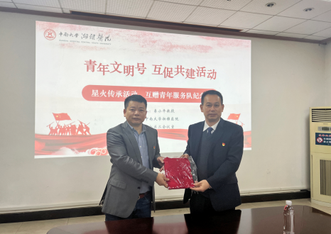 (中南大学湘雅医院第四党总支书记唐献忠书记和株洲市三三一医院第十四党支部书记、放射科主任田强互赠青年服务队纪念品)