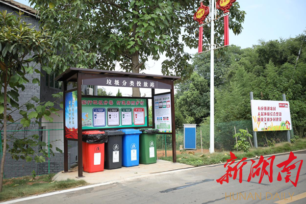 仔细一看,村里家家户户门前都放置了垃圾桶。不远处,垃圾分类亭设置醒目,垃圾箱整齐摆放,垃圾转运车正在对分类垃圾进行集中清运。