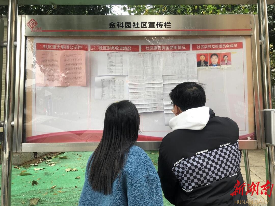 “社区不管大钱小钱、用在何处,整个流程都是透明公开的,也会在社区宣传栏公示出来。”近日,雨花区砂子塘街道金科园社区对外公示社区全年支出及明年预算建设项目,居民李婷和张鹏在社区宣传栏前仔细查看,他们表示,社区的项目建设、资金使用等情况都严格按照相关流程让居民全程参与,并在社区宣传栏公示公开,居民群众能够清楚了解社区建设、惠民资金使用的全过程,大伙心里更加敞亮了、也更支持社区的工作了。