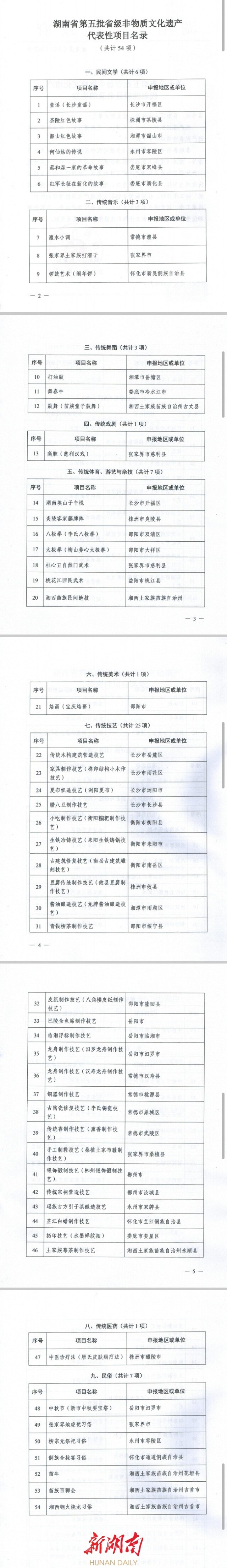 湖南省第五批省级非物质文化遗产代表性项目名录共104项,其中新增54项,扩展50项。今年3月,我省启动第五批省级非遗代表性项目申报,经过严格的评审,评选出第五批省级非遗代表性项目54项、扩展项目50项。