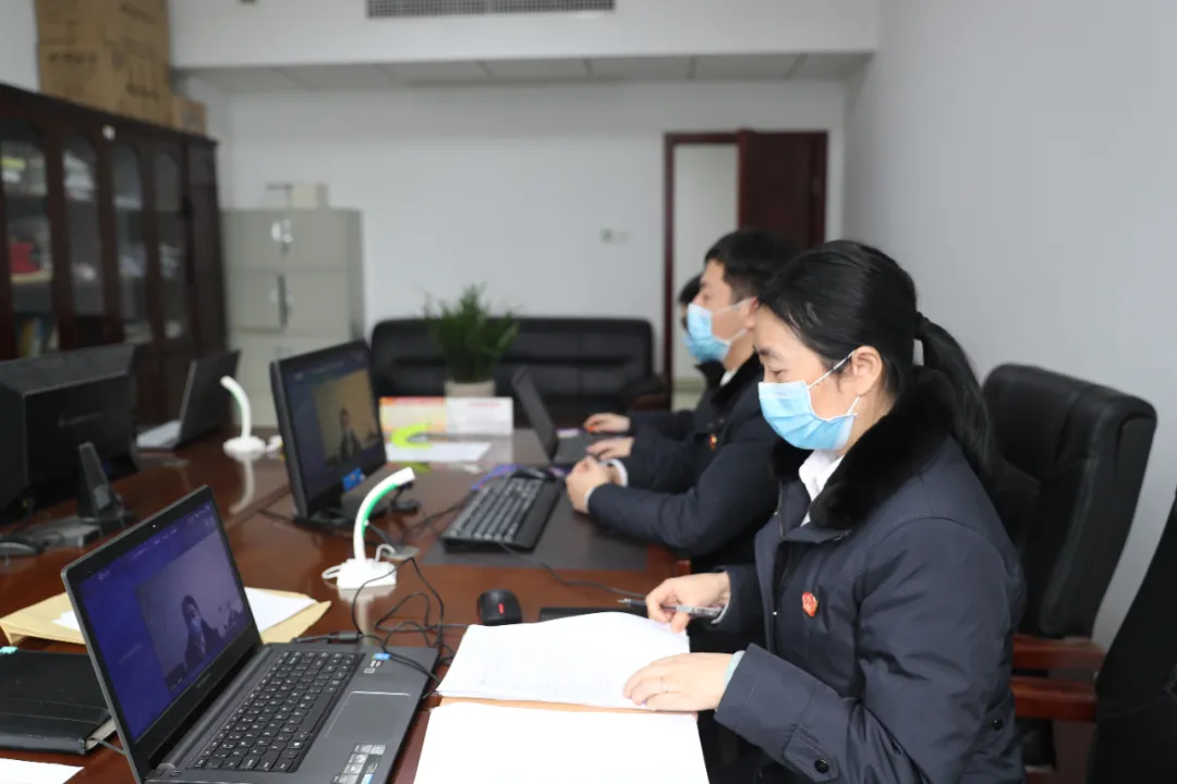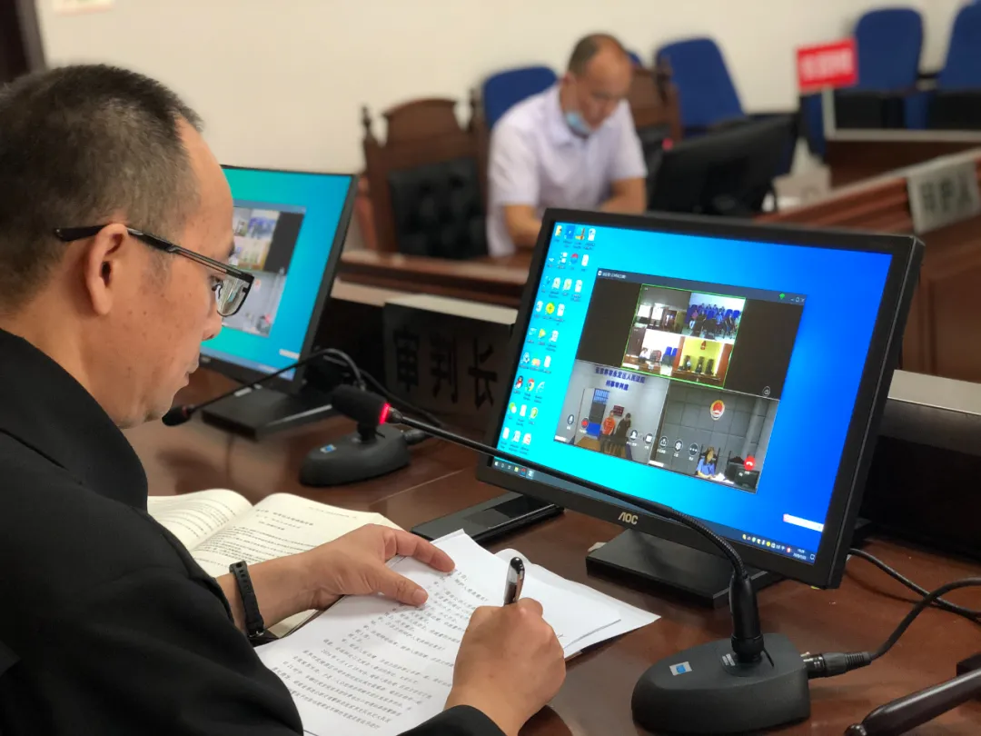 永定区法院在全市率先开通“刑事远程庭审+网络直播”系统,实现法官、公诉人、被告人三方“云上参审”。图:向进