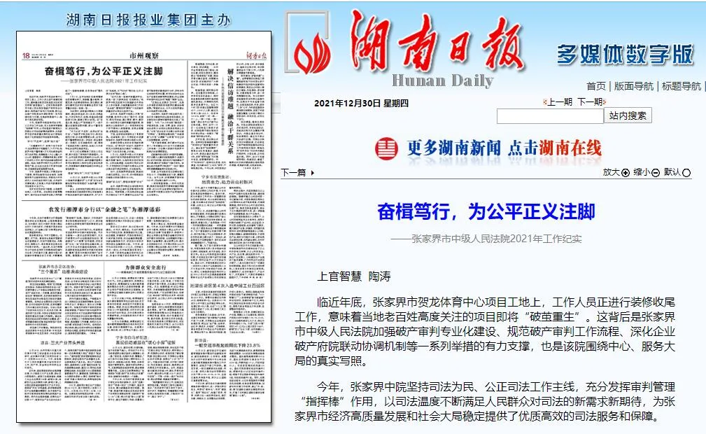 12月30日,《湖南日报》刊载市中院2021年工作纪实文章。