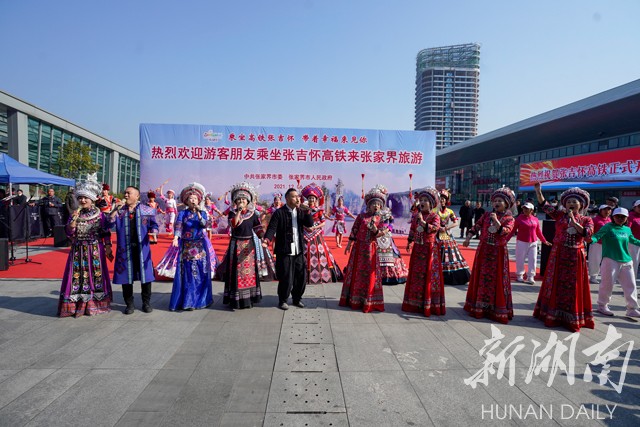 在张家界西站前广场上举行的张吉怀高铁开通庆祝仪式上,锣鼓声、歌舞声、欢呼声,声声气吞山河,一派喜气祥和之感。