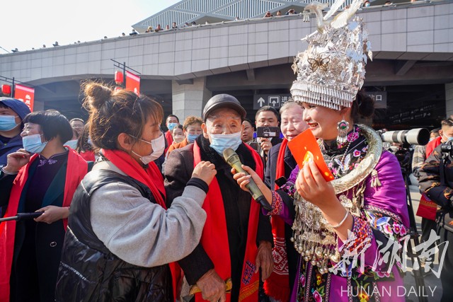 待乘客缓缓走入人群,张家界市人民政府副市长欧阳斌为每一位游客献上一条大红色的土家织锦围巾。随即,土家打溜子、拦门酒、桑植民歌、土家摆手舞等纷纷上场,张家界人用最盛情的方式款待远方的游客。
