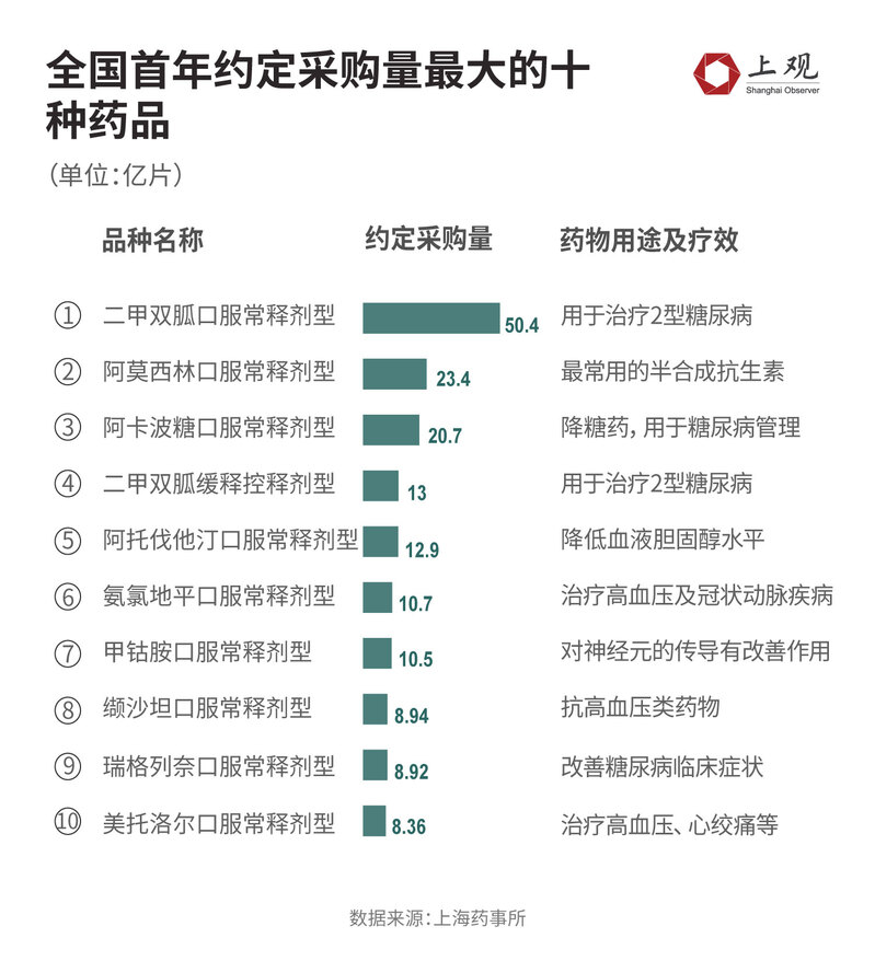 “带量”是集采的核心,“以量换价”才能推动企业降价。那么,采购量最大的十个品种分别是哪些?从全国首年约定采购量可见,需求最大的仍是糖尿病、高血压、高血脂等常见病用药。用于治疗2型糖尿病的二甲双胍口服常释剂型采购量最大,首年约定采购量高达50亿余片,全国首年实际采购数量超80亿片。