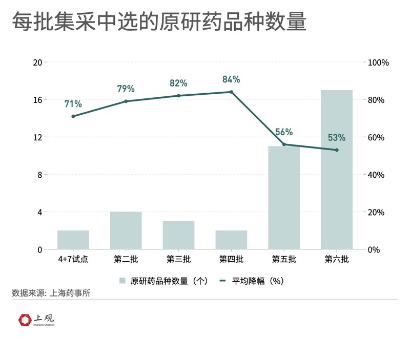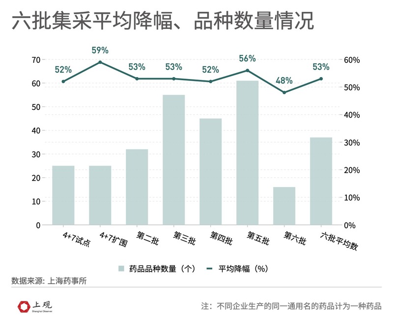 在六批七轮集采中,前五批六轮都是化学药集采。从第一批“4+7带量采购”到第五批带量采购,一共覆盖218个品种,中选产品价格平均降幅达到53%,累计为患者减负约2500亿元。