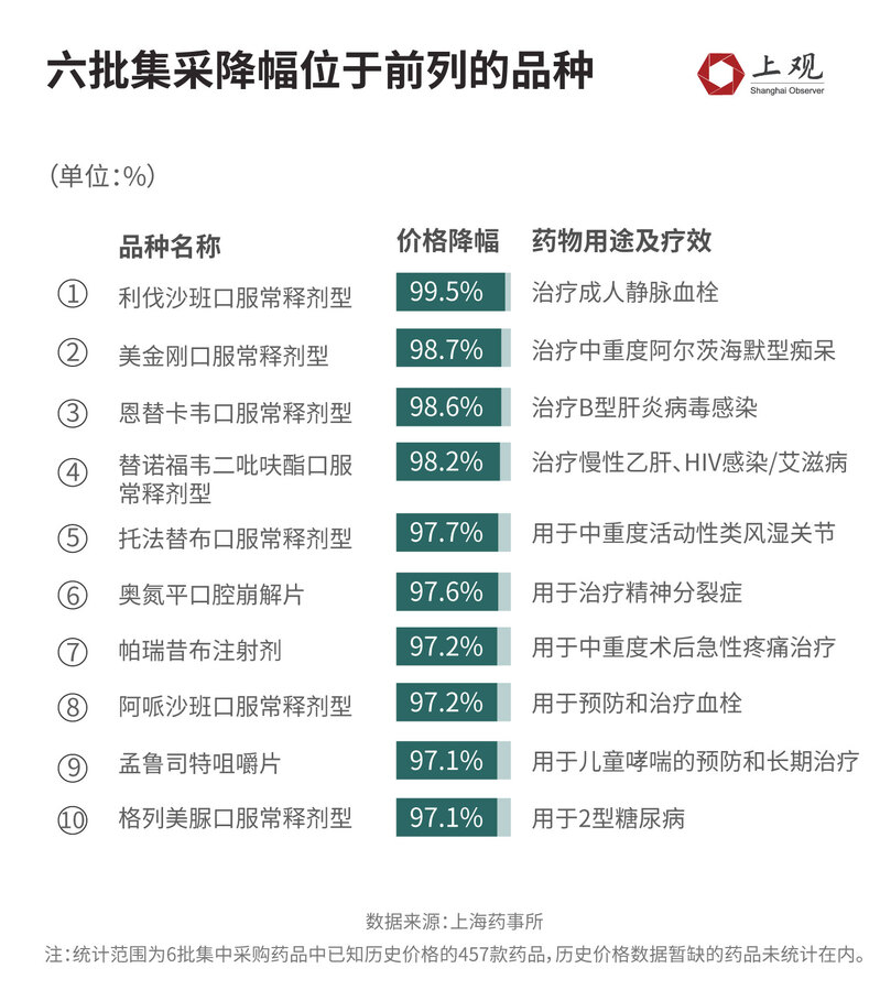 六批集采,哪些品种降幅最高?综合已知历史价格的457款药品,可以大致看到,名列前茅的药物用途各不相同。第五批集采中的抗凝药利伐沙班降幅高达99.5%,是名副其实的“降价王”。而用于治疗阿尔茨海默症的美金刚、治疗精神分裂症的奥氮平两种精神类疾病用药,也都以超97%的降幅位于前列。以奥氮平口崩片为例,患者原来一个月要花849元,现在使用中选品种可节省822元,一年可省9859元。