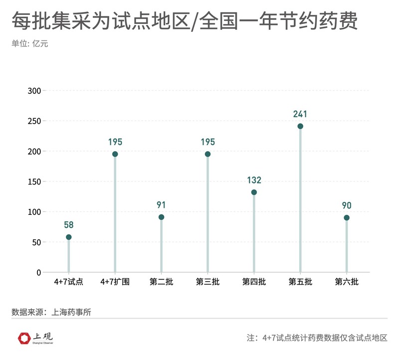 集采不仅减轻了群众用药负担,还提高了医保基金使用效率。经过测算,每批招标结果一年分别为试点地区或全国节约药费58亿元、195亿元、91亿元、195亿元、132亿元、241亿元和90亿元。其中,第五批集采中选品种最多,共涉及金额550亿元,节约药费创下历次集采之最。