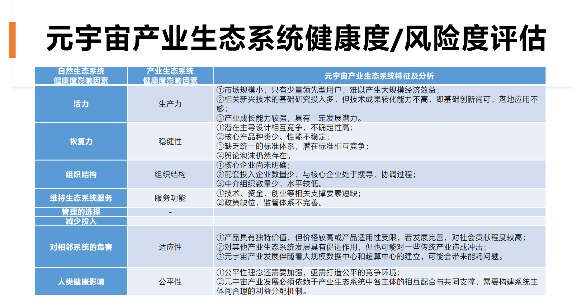 而在产业雏形期,报告称,“站在风口”的元宇宙产业机遇与风险并存,但整体处于亚健康状态,至少存在十大风险点。