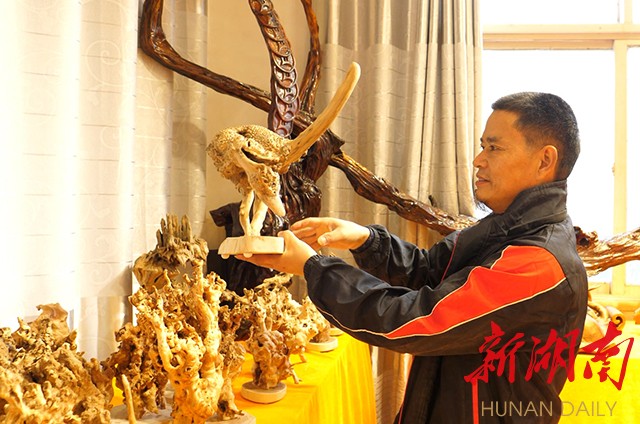 “我现在做的作品,以自然根雕为主,凸显我们会同本地材料的特质,在上面融入苗族和侗族的一些文化元素......”介绍起木雕作品,张劲显得格外激动。