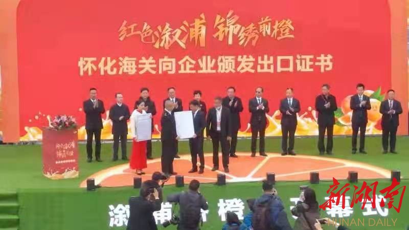 湖南日报·新湖南客户端讯(作者 梧桐树下)12月14日上午,以“红色溆浦·锦绣前‘橙’”为主题的溆浦脐橙节在大江口镇开幕,活动中怀化海关向企业颁发果园和包装厂注册证书、出口脐橙电子底账及植物检疫证书,装满20吨溆浦脐橙出口东盟的首批专车正式发车,标志着溆浦脐橙首次实现自营出口。