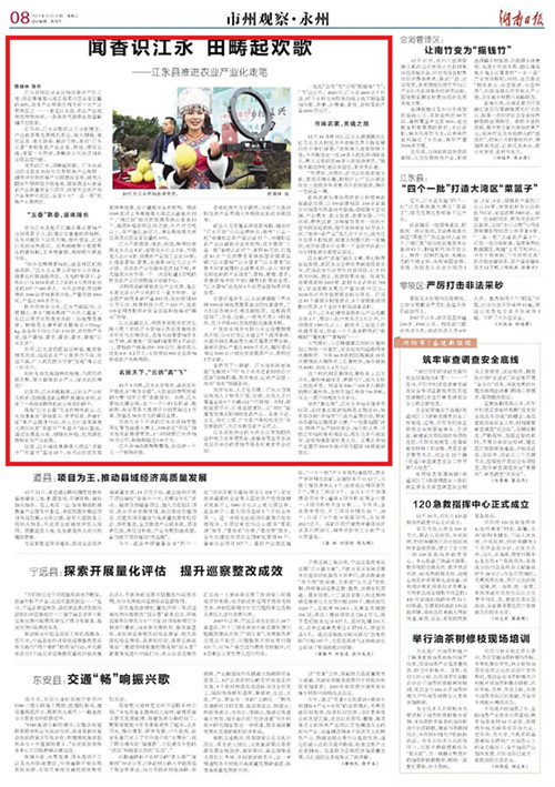 近年来,江永县坚持以工业化理念、产业化思维发展现代农业,做大规模、做优品质、做长链条、做活市场,推动“江永五香”等特色农产品出省、跨境、漂洋过海,带富一方百姓,奏响农业大县迈向农业强县进行曲。