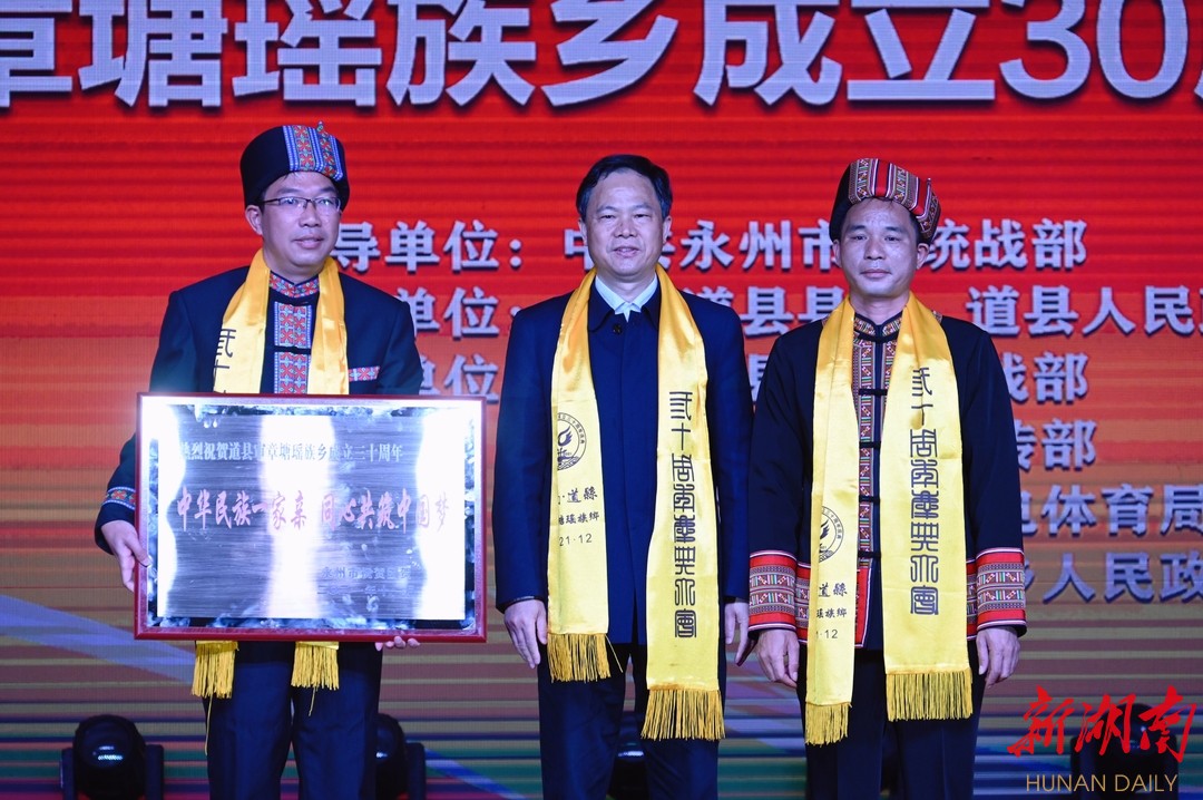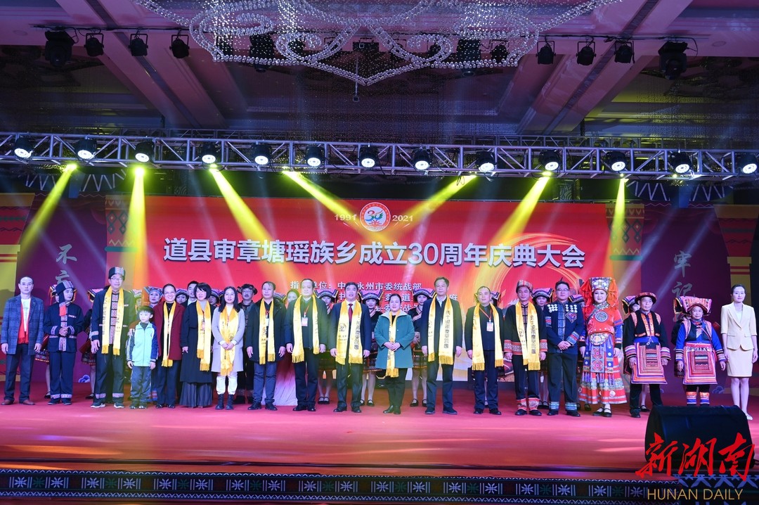 湖南日报·新湖南客户端12月20日讯(记者 王柯沣 通讯员 盘林 谢万波)12月20日,道县举行审章塘瑶族乡成立30周年庆典大会。湖南省民宗委一级巡视员、省政协委员学习联络委员会副主任、省祝贺团团长赵仁秀,永州市副市长、市祝贺团团长谢景林出席庆祝活动并向审章塘瑶族乡赠送贺匾,道县县委书记李天明等县领导出席活动。