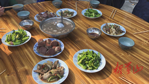 湘江源瑶族乡桐村地处大山深处,一直保持着杀猪过年的习俗,“冬至”一到,瑶民们就开始忙着杀年猪。每当这个时候,瑶民们通常会摆几桌请村里的邻居一起吃血灌肠、喝猪肉汤,分享这一年来的收获,剩下的肉便用来熏腊肉。