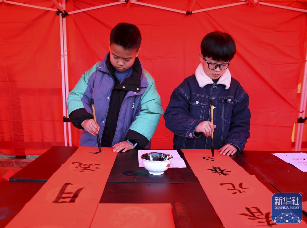 1月1日,小朋友在江苏省淮安市洪泽湖古堰景区写对联。新华社发(陈凯摄)