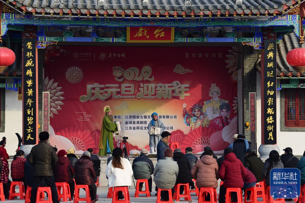 1月2日,市民在江苏省淮安市金湖县尧帝古城庙会广场观看淮剧。新华社发(梁德斌摄)
